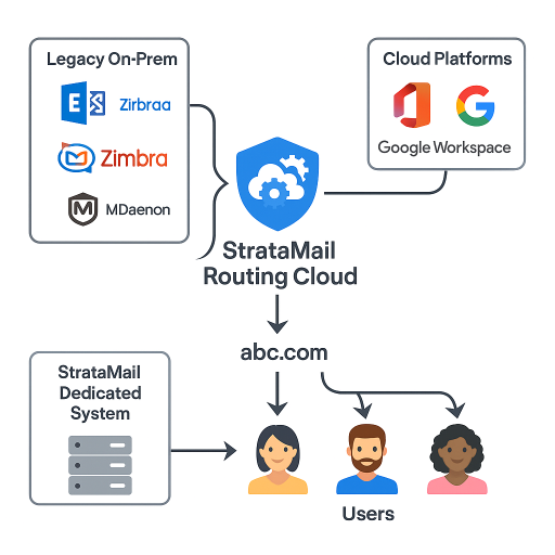 The StrataMail Routing Cloud acts as an intelligent intermediary, handling inbound filtering, outbound relay, and smart routing across both your legacy systems and modern cloud platforms. Whether you're planning a phased migration to Microsoft 365, maintaining hybrid infrastructure for compliance reasons, or simply modernizing parts of your email stack, StrataMail provides the routing intelligence and security layer you need.